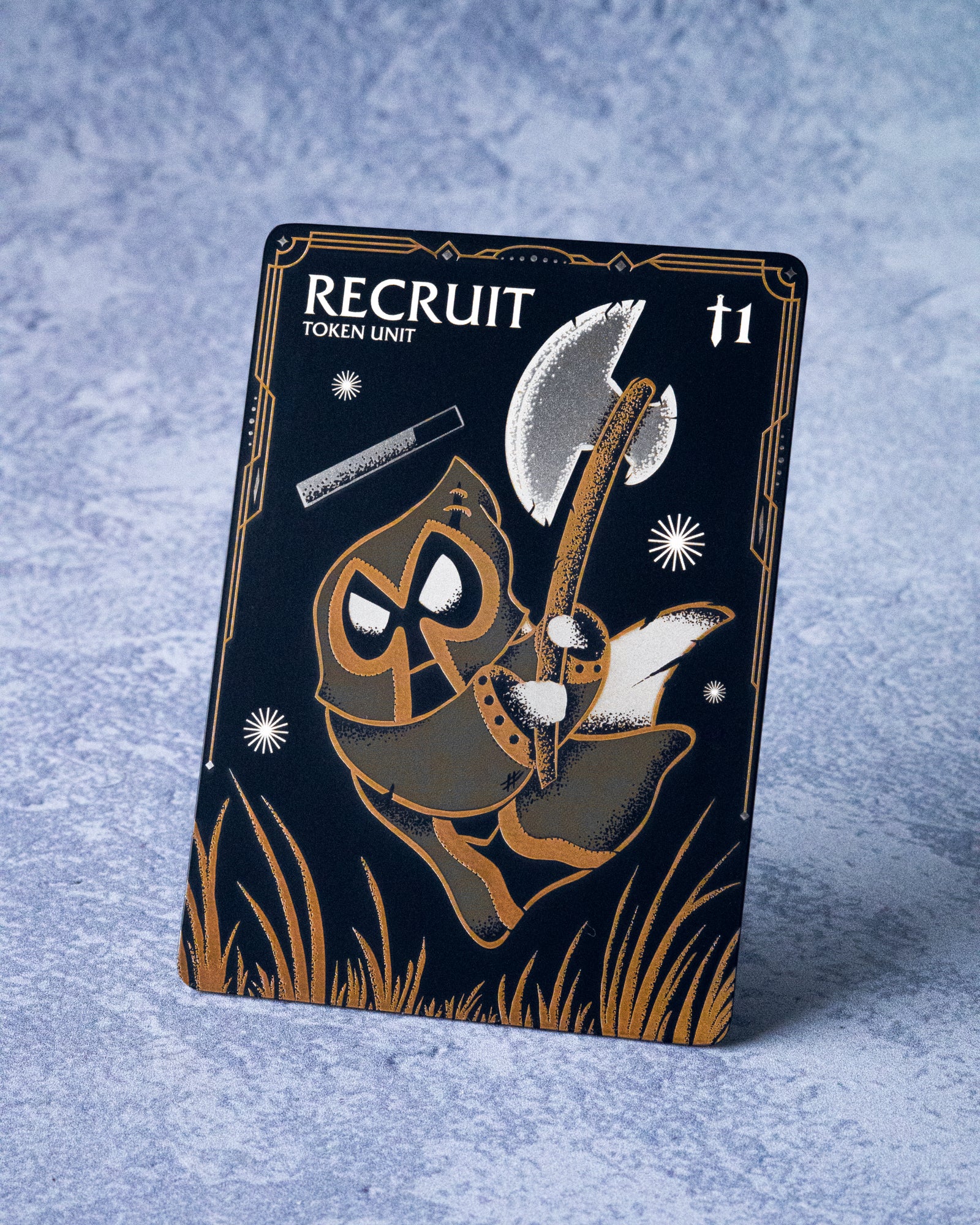 A Recruit Token engraved into matte black stainless steel. Made to use with the new Riftbound TCG based on League of Legends!